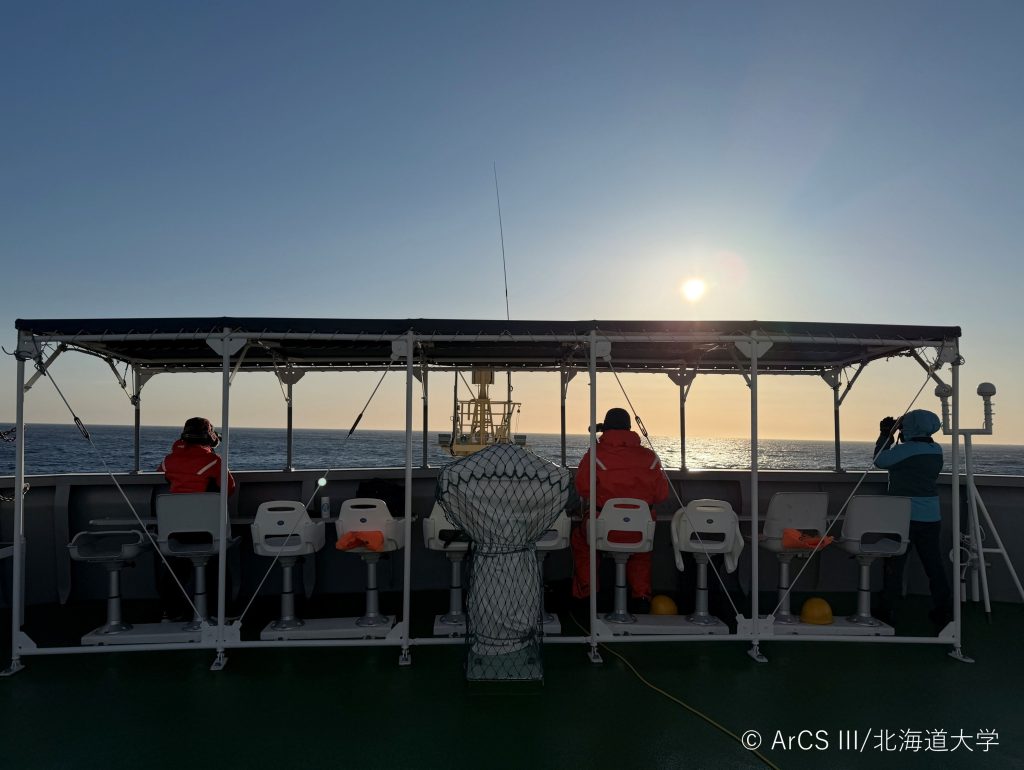 気温は1℃前後で寒く,風も強い中での目視調査でした.ムスタングスーツを着ながら調査する日もあり,北極航海の良い練習になりました.